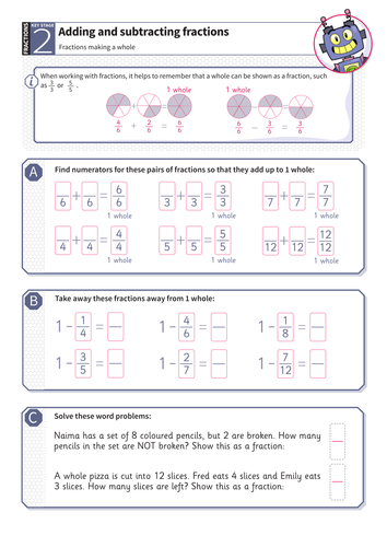 Adding Fractions To Make A Whole Ks2. Various differentiated worksheets aimed at getting children to understand how to add fractions, that have the same denominator, to make a whole one. Key stage 2, maths, fractions.